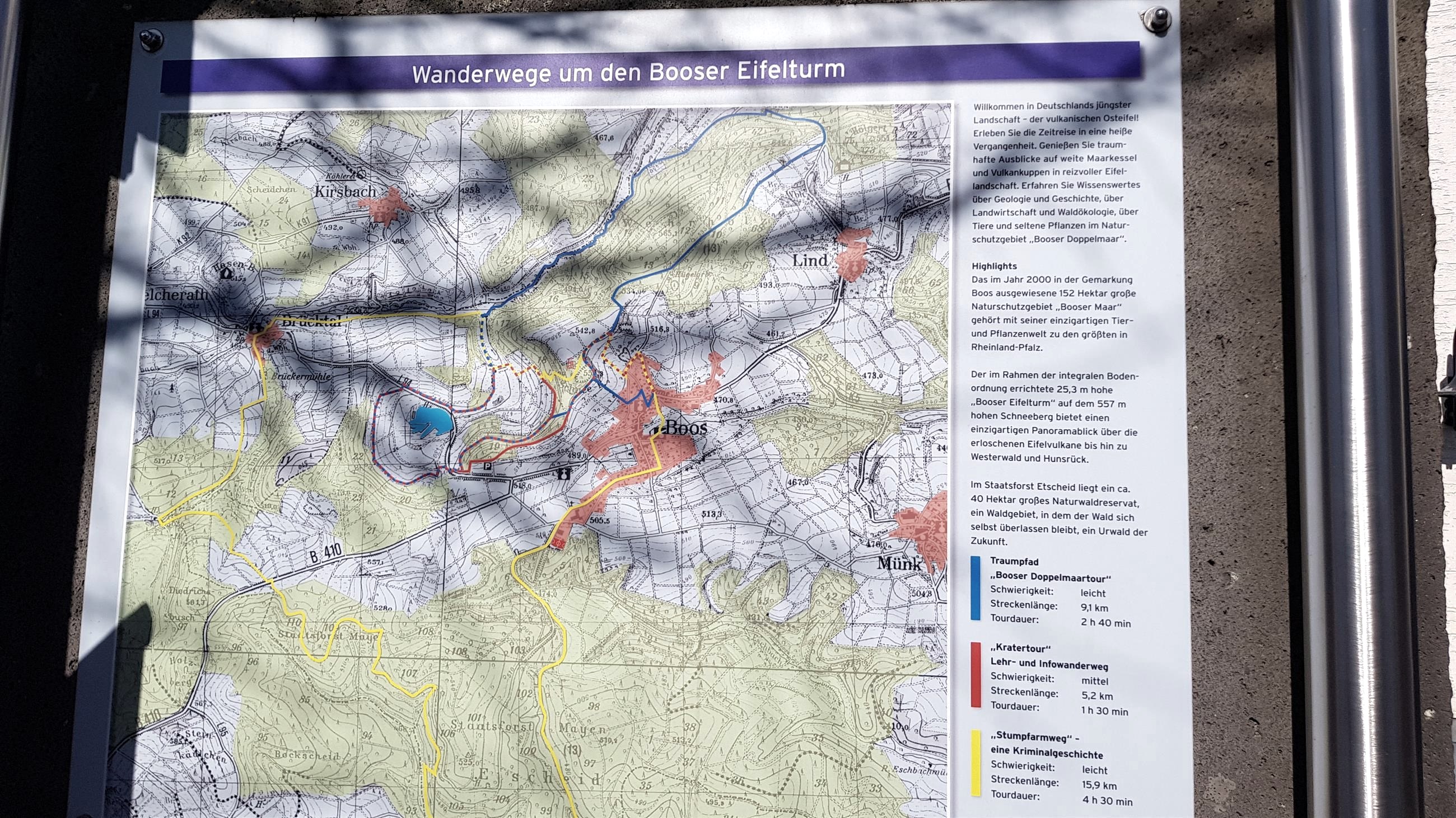 Die Vordereifler Touren „Stumpfarmweg“ und „Krater-Tour“ führen - als Rundwanderwege - am Booser Eifelturm (aktuell gesperrt) und den beiden Booser Maaren vorbei. Ihre Entstehung verdanken sie dem explosiven Zusammentreffen von aufsteigendem heißem Magma und Wasser. Entlang der „Krater-Tour“ geben Infotafeln u.a. über den Vulkanismus sowie die heimische Tier- und Pflanzenwelt Auskunft.