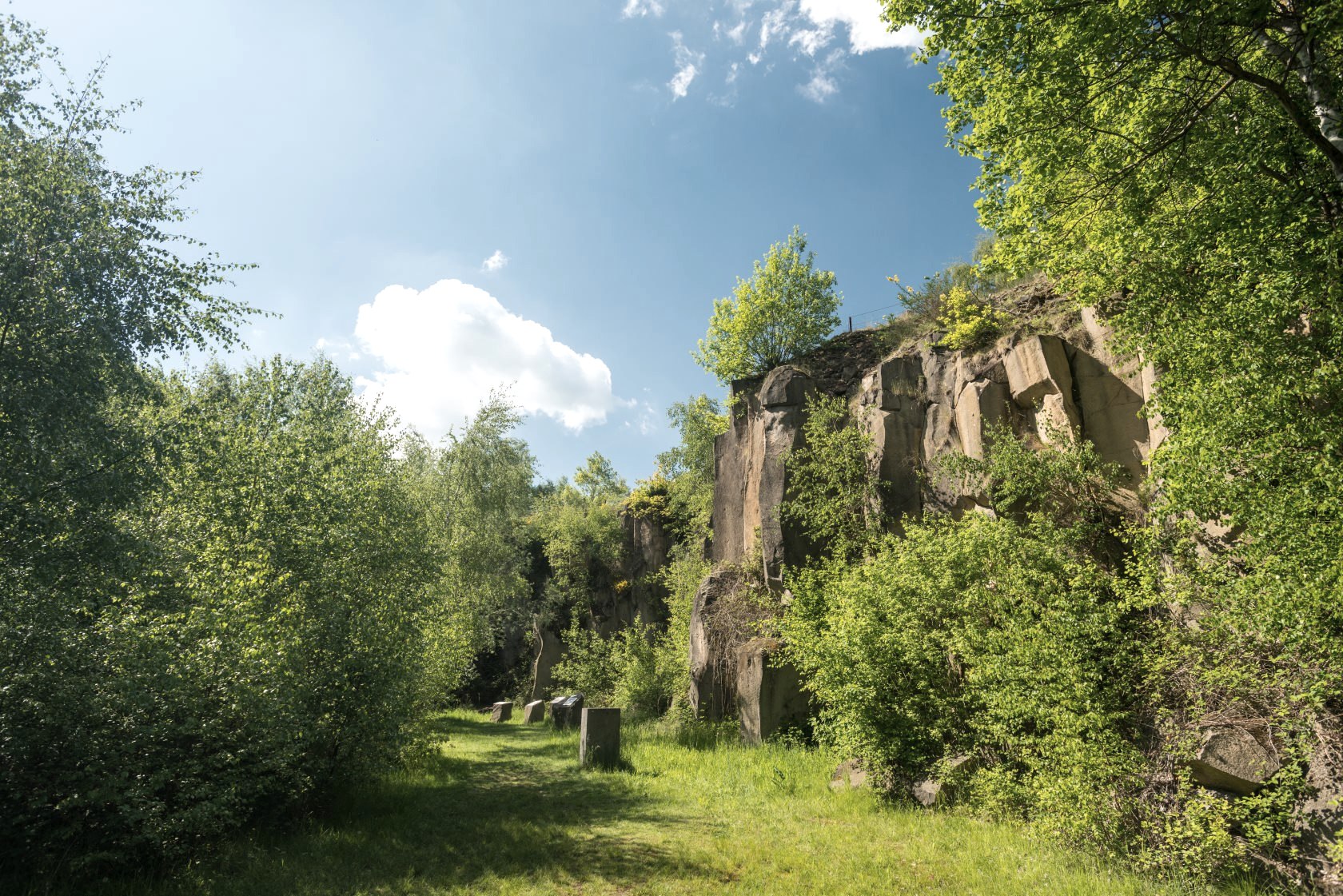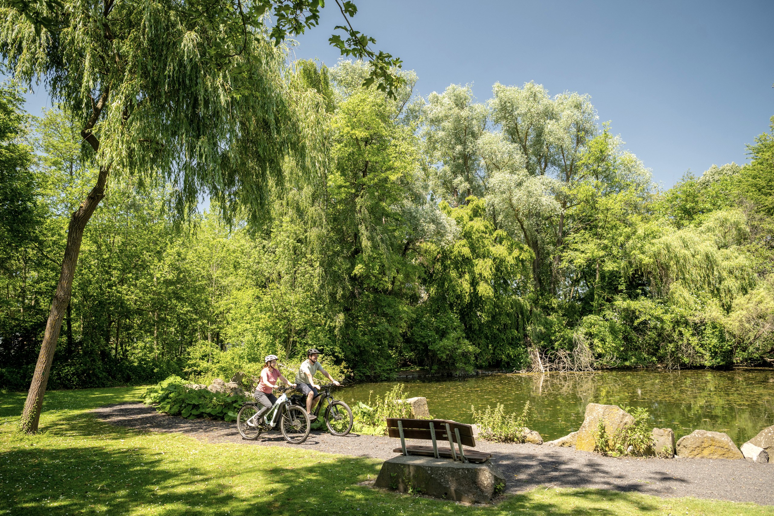 Ausgeschilderte Schleifen führen vom Vulkanpark-Radweg zu Sehenswertem in der Nähe: In der multimedialen Erlebniswelt des Lava-Domes von Mendig und in den geheimnisvollen Lavakellern kommt man dem Vulkanismus ganz nah, in der Vulkanbrauerei über den Kellern gibt es Leckeres und Erfrischendes. Zu den Glücksmomenten gehören die entspannenden Stopps, etwa an den Wiesen bei Thür, auf denen friedliche, mächtige Wasserbüffel grasen. Der idyllische Rauscherpark in Plaidt liegt direkt am Radweg. Über mächtige Basaltblöcke ergießt sich der Fluss in kleinen Kaskaden und gibt den Blick auf ein wildromantisches Tal frei.