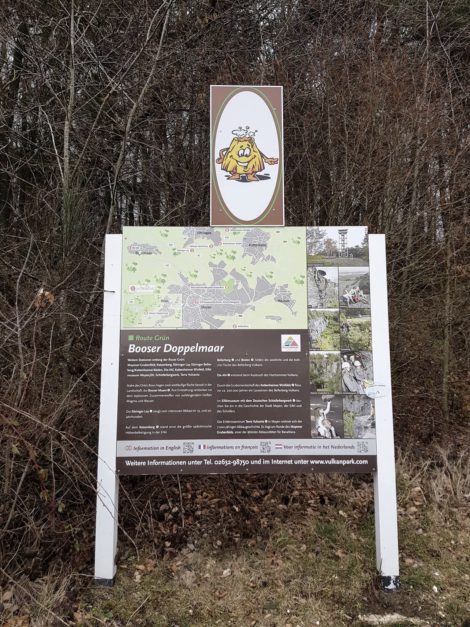 The "Booser Doppelmaar", located west of the municipality of Boos, are two large flat boilers in the countryside, one of which is a dry maar, the other now a pond. They owe their origins to the explosive confluence of rising hot magma and water. In outcrops, the layers deposited during the volcanic eruptions can still be observed today.