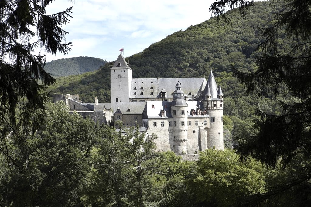 Après avoir visité l'abbaye bénédictine du côté ouest de l'abbaye de Maria-Laach, à la chapelle Saint-Jean, le >Osteifelweg< se dirige vers le sud. Le long de l'abbaye, un léger virage à droite traverse la forêt et longe l'ancien musée d'histoire naturelle, en passant sous l'A 61. D'abord en direction de l'ouest, puis en tournant à gauche vers le sud, monter jusqu'à la K 56. Traverser celle-ci et continuer à monter légèrement vers Bell (2,9 km). Traverser le village, les champs et la forêt, maintenant en même temps que le sentier de rêve >Vier-Berge Tour<, passer devant l'Erlenhütte et la source >Erlenborn<, traverser le Kellbach, après env. 300 m à droite et monter jusqu'au col du >Hochstein<, continuer à monter avec un virage en épingle jusqu'à la >Genovevahöhle< (6,1 km) et le point de vue - le sentier volcanique (13) est suivi sur environ 300 m - puis descendre jusqu'à la L82, où le sentier de rêve part à droite. Sur la L82, tourner à gauche, après l'aire de repos et le parking, tourner à droite en direction du sud-ouest, bientôt à droite vers la >Simmerhütte< avec parking et point de secours, monter vers le Hochsimmer avec des vues fascinantes au loin et en rêve et une aire de repos (9,6 km), - tour panoramique, plus haute montagne volcanique de l'Eifel de l'Est, mur du cratère avec percée vers le sud. - Descente en lacets jusqu'à la L83 dans la vallée de Nettetal jusqu'au Hammesmühle (13,2 km) avec un parking, un Biergarten et un restaurant historique. restaurant.
