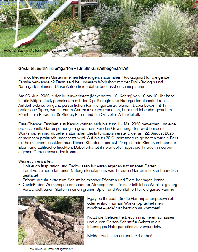6. Juni 2026 – Der Workshop findet in der Kulturwerkstatt – Mayenerstr. 16 in Kehrig von 10-16 Uhr statt. Hier wird der Plan des Gewinnergartens besprochen. Außerdem planen alle Teilnehmende mit Tipps von Frau Ulrike Aufderheide ihren ganz persönlichen Familiengarten. Ihr bekommt praktische Tipps, wie ihr euren Garten insektenfreundlich und bunt gestalten könnt– ein Paradies für die ganze Familie.