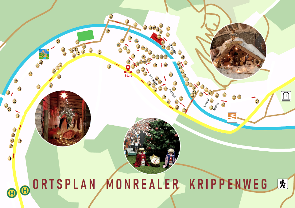 Entlang des "Monrealer Krippenweges" lassen sich im historischen Ortskern über 150 – zum Teil sehr ausgefallenen – Weihnachtskrippen, die entweder das Anwesen oder einzelne Fenster schmücken, bestaunen und versetzen garantiert jeden in Weihnachtsstimmung.