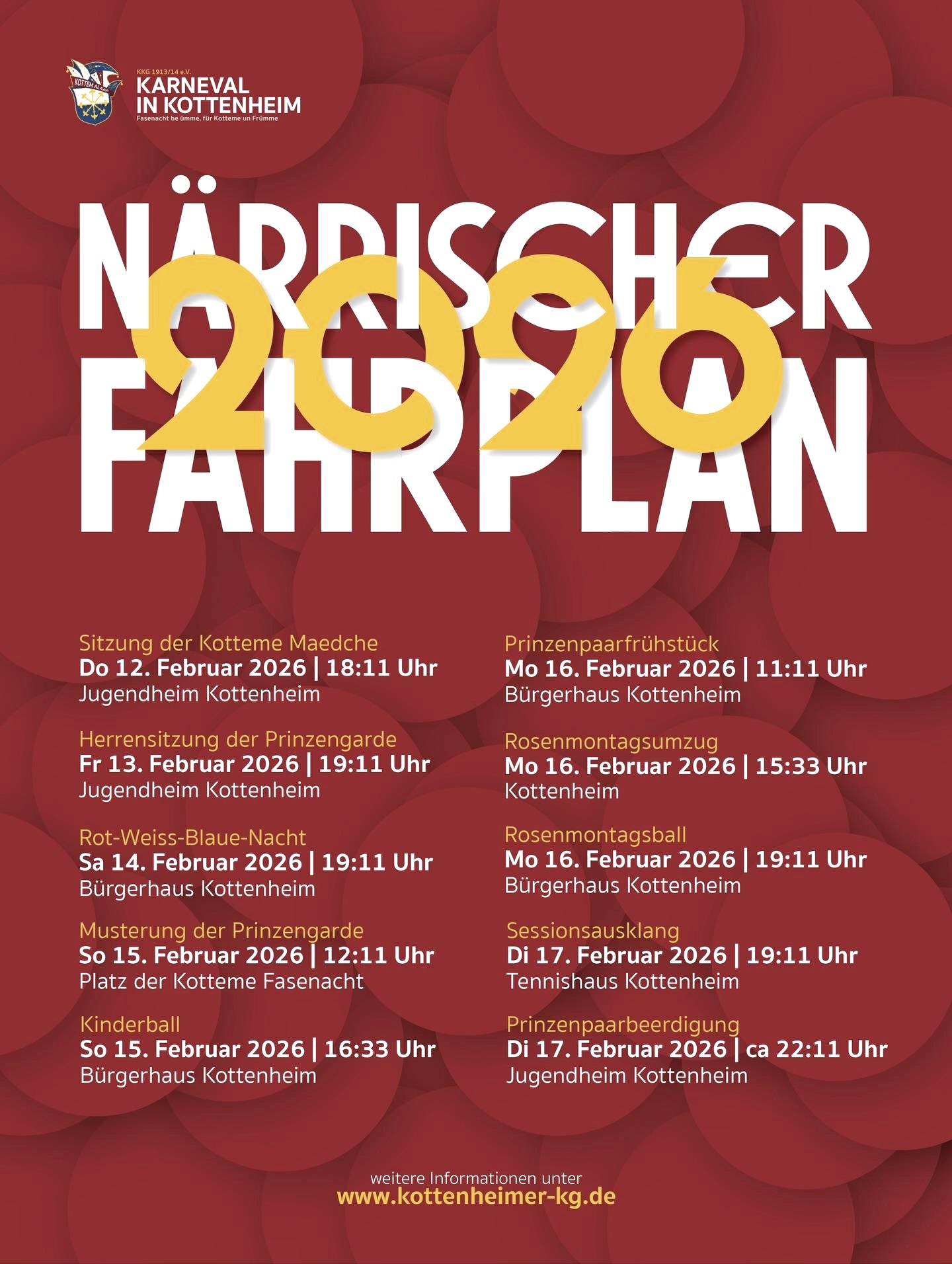 Rosenmontagszug in Herresbach16.02.2026Am 16.02.2026 findet in Herresbach und Döttingen wieder der traditionelle Rosenmontagszug statt! Start ist um 14:11 Uhr in Döttingen, von wo aus der Zug dann bis zum Dorfplatz in Herresbach ziehen wird. Im Anschluss an den Zug wird es auch dieses Mal wieder Live-Musik mit „Eddy and the Trumpet“ im beheizten Festzelt auf dem Dorfplatz geben!