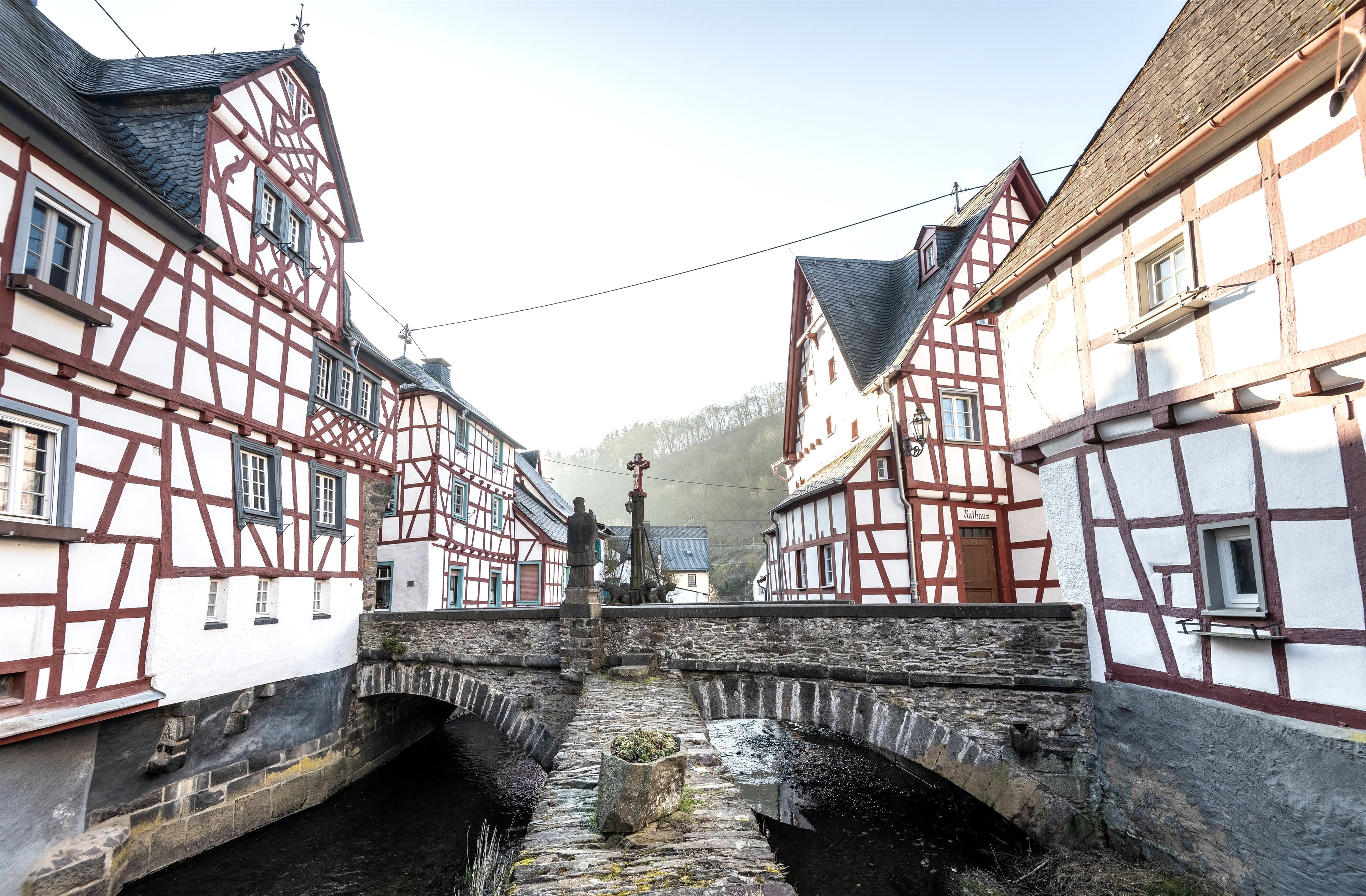 Das Viergiebelhaus und die malerischen Fachwerkhäuser bieten die perfekte Kulisse für das bunte Markttreiben auf dem Monrealer Marktplatz unterhalb der beiden Monrealer Burgen - Löwen- und Philippsburg.