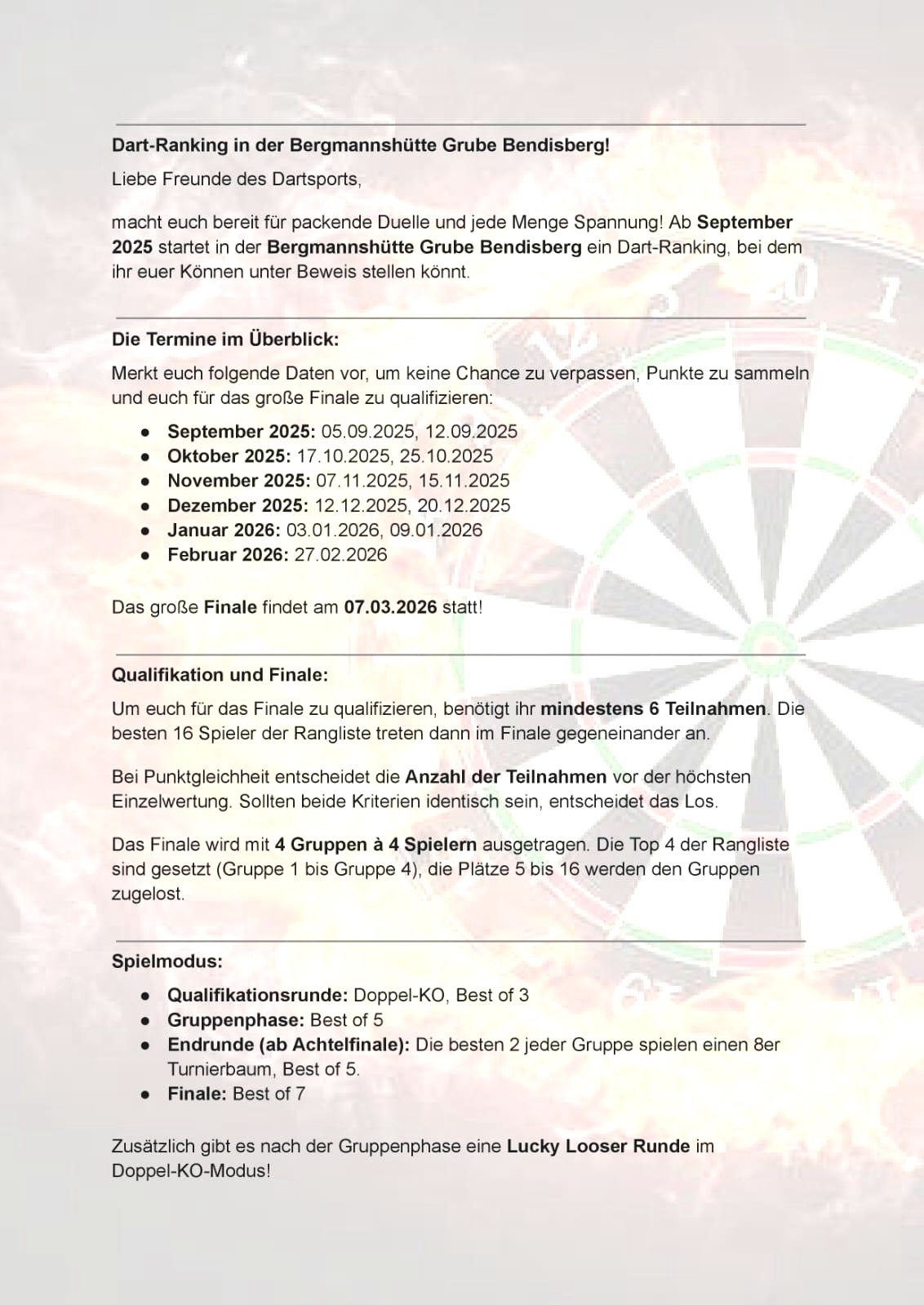 Bereid je voor op spannende duels en veel spanning. Vanaf september 2025 gaat er een dartsranking van start in de mijnwerkershut in de Bendisbergmijn.