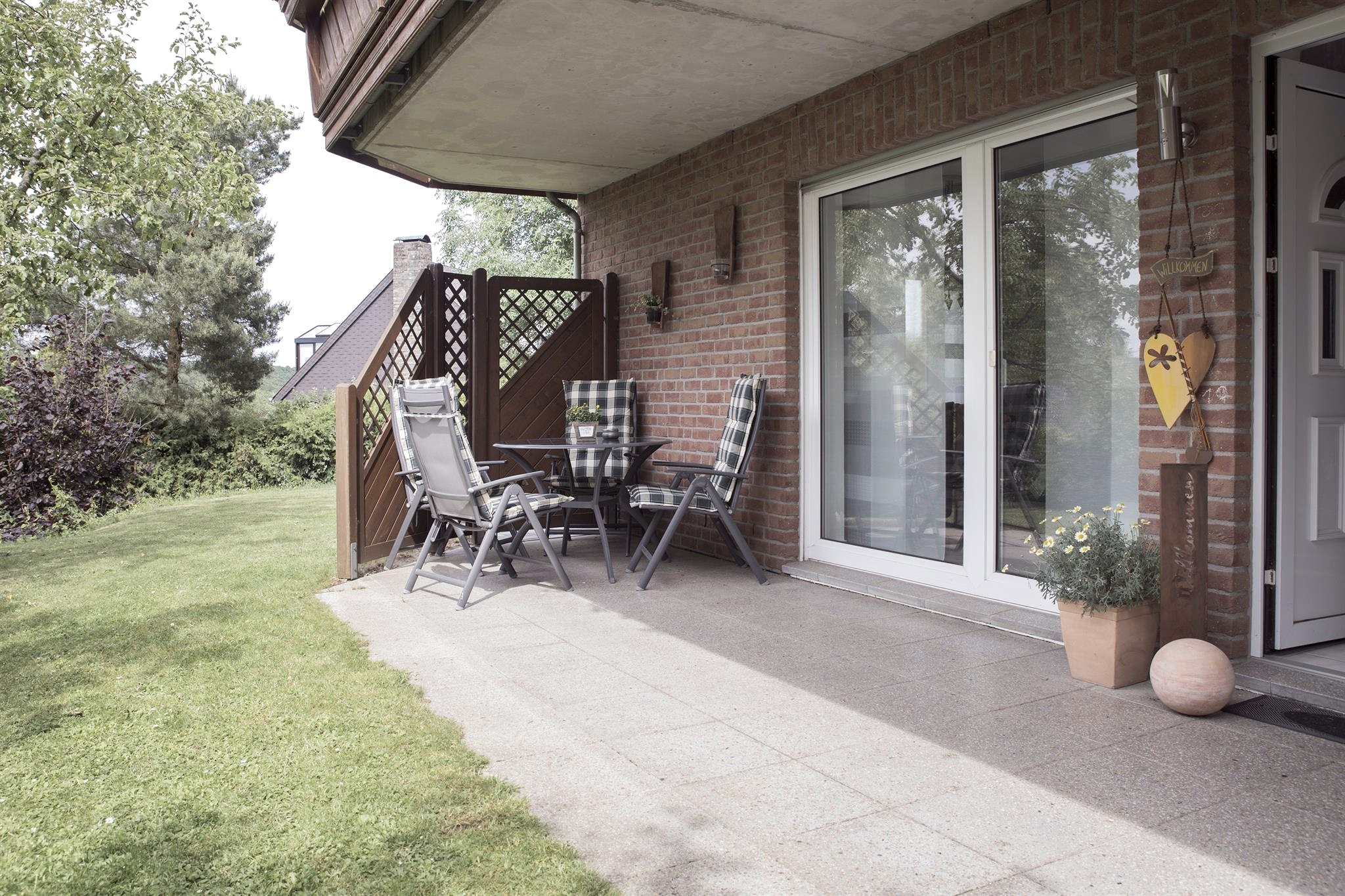 Zur Unterkunft gehört eine große Terrasse mit Grill und Liegewiese, sowie ein Parkplatz direkt am Haus.