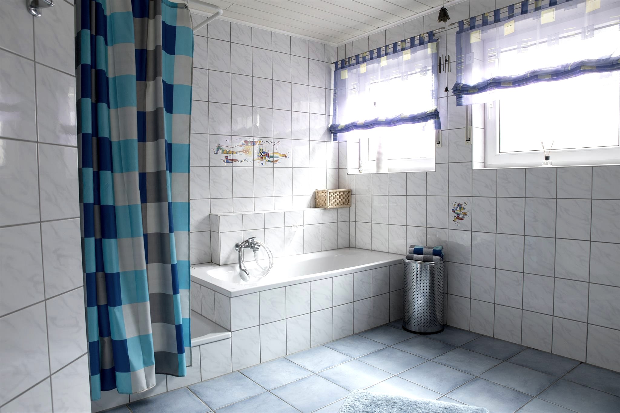 Das geräumige Bad verfügt über eine Badewanne mit WC, Dusche und Fön.
