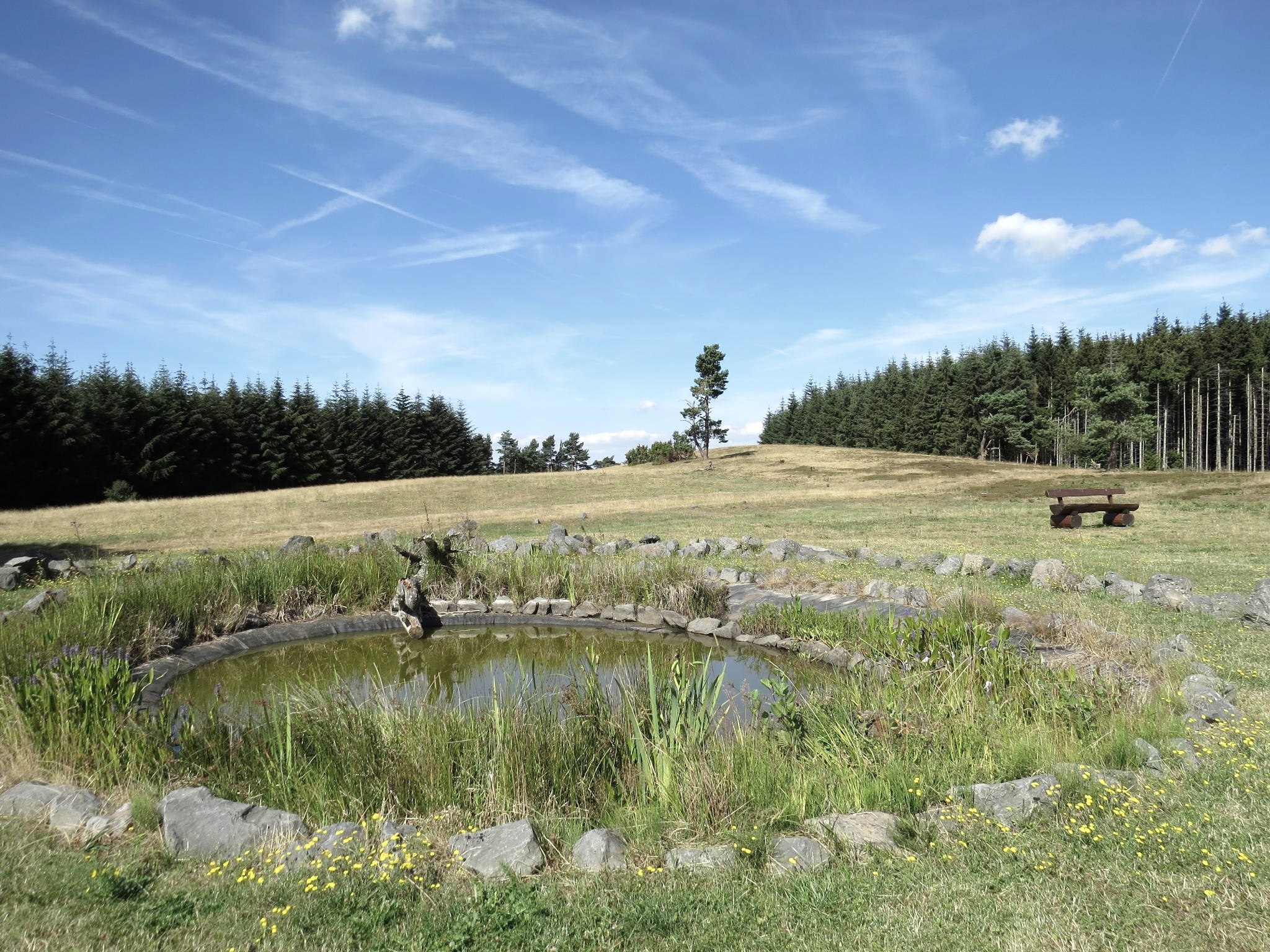 Nachdem die L10 gequert wurde, führt der Weg zunächst talwärts, bevor es rechts ab zum Gipfel des Kindgen geht. Hier auf dem höchsten Punkt des Wanderweges bietet sich ein traumhafter Ausblick über die vulkanische Osteifel und mit dem "Heidetümpel" ein einzigartiges Biotop.
