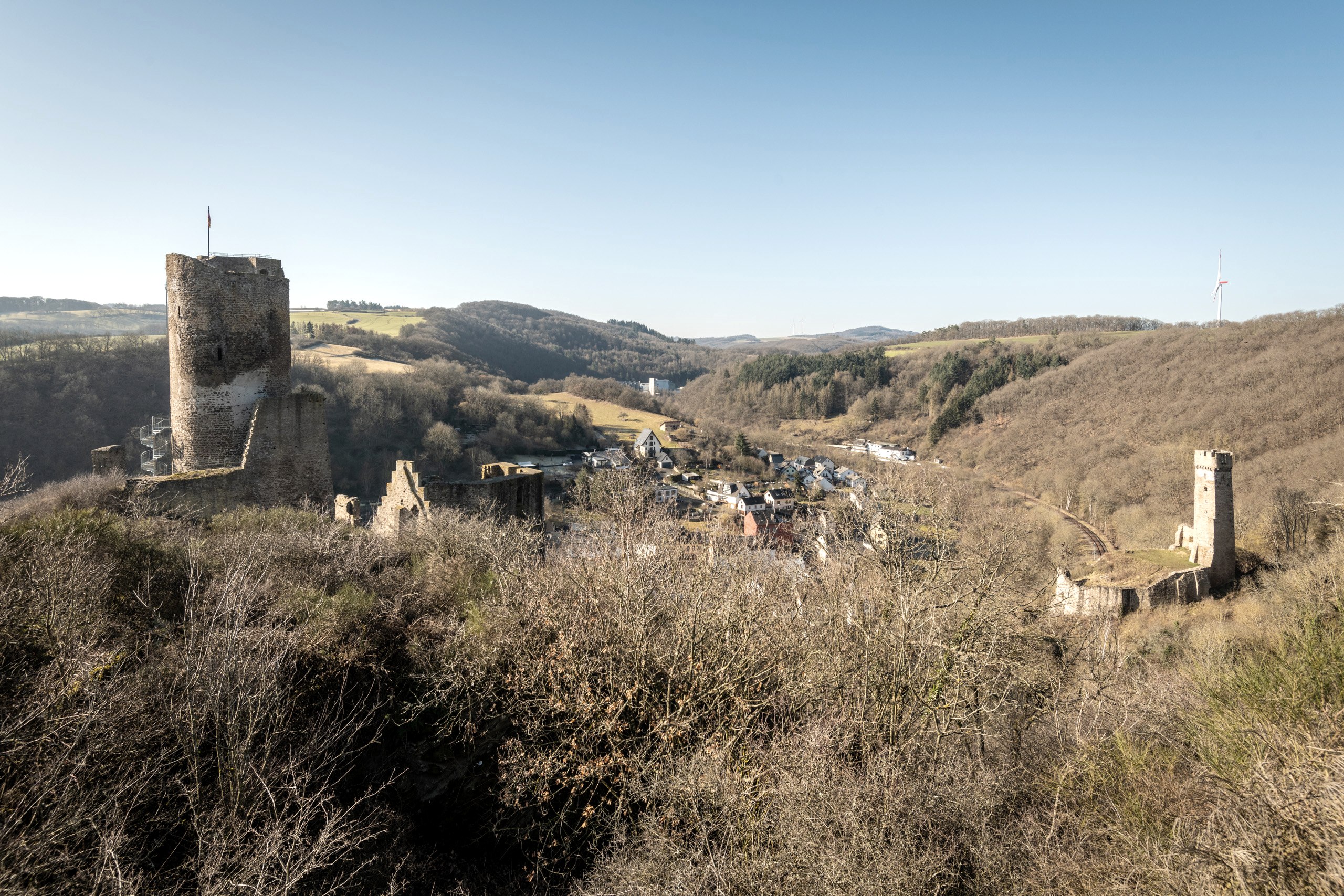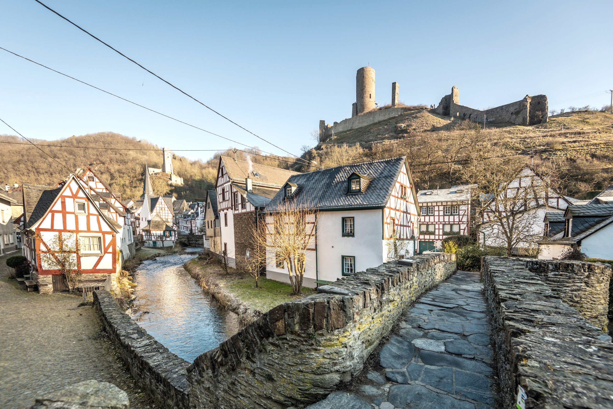 Die Route startet im malerischen Ortskern, der mit wuchtigen Natursteinbrücken und einer sehenswerten Pfarrkirche noch einmal mehr fasziniert. Steil geht es hinauf zur Löwenburg, deren noch immer knapp dreißig Meter hoher Bergfried bestiegen werden kann. Grandios ist der Ausblick auf die kleine, in dichte Wälder gekuschelte Stadt Monreal am Ufer der Elz und auf die benachbarte Phillipsburg, deren Ruine nur einen Steinwurf entfernt ist. Sie kann mit etwas Abenteuerlust über einen schmalen Felspfad erreicht werden.