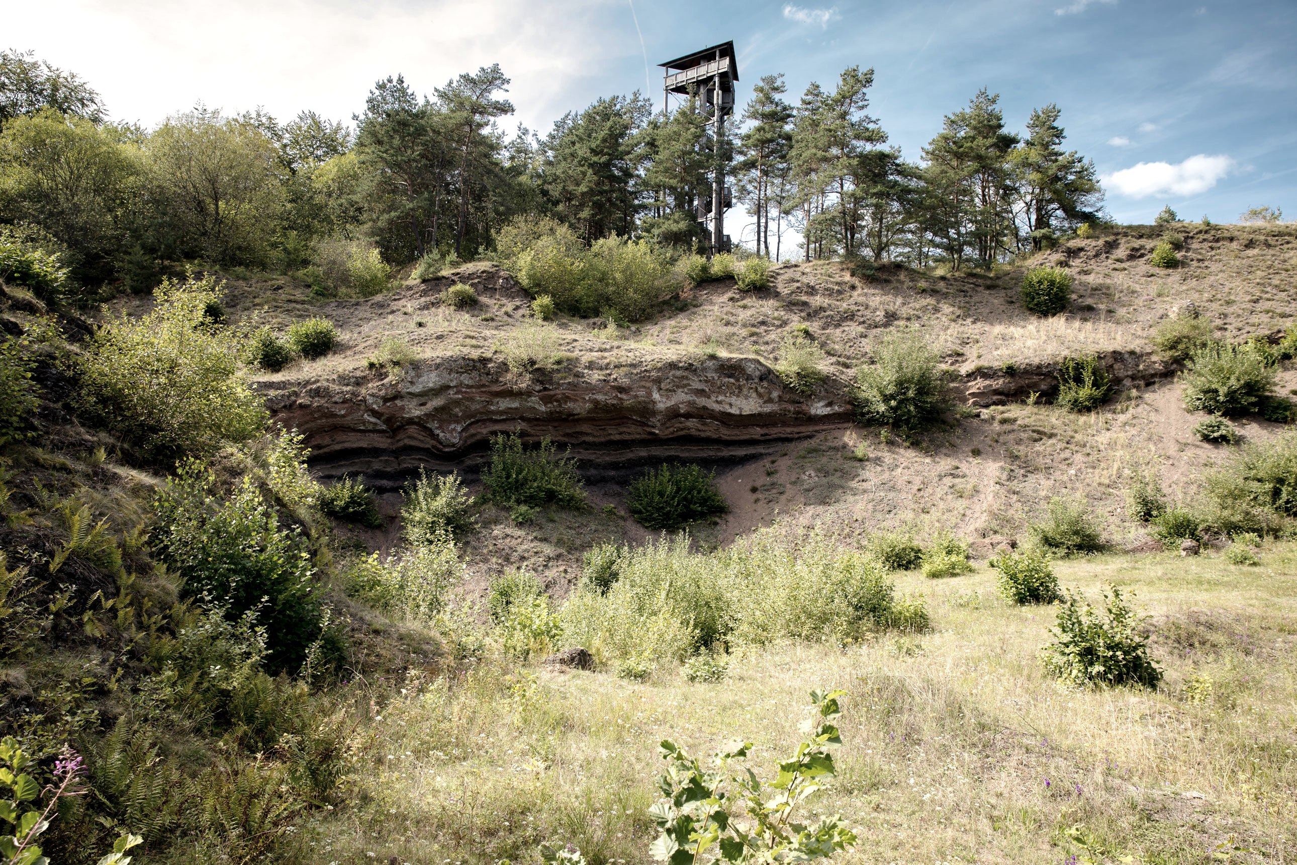 An einem Rastplatz mit Vulkanaufschluss versetzt eine Lavabombe die Wanderer ins Staunen. Nach kurzem Anstieg wird wieder der breite Weg erreicht und kurz darauf bleibt der gesperrte Eifelturm unbeachtet links liegen. Die Route verläuft durch offenes Terrain, was einen tollen Blick hinüber zur Nürburg erlaubt. Am Boosblick bieten zwei Bänke Gelegenheit, die Aussicht in Ruhe zu genießen