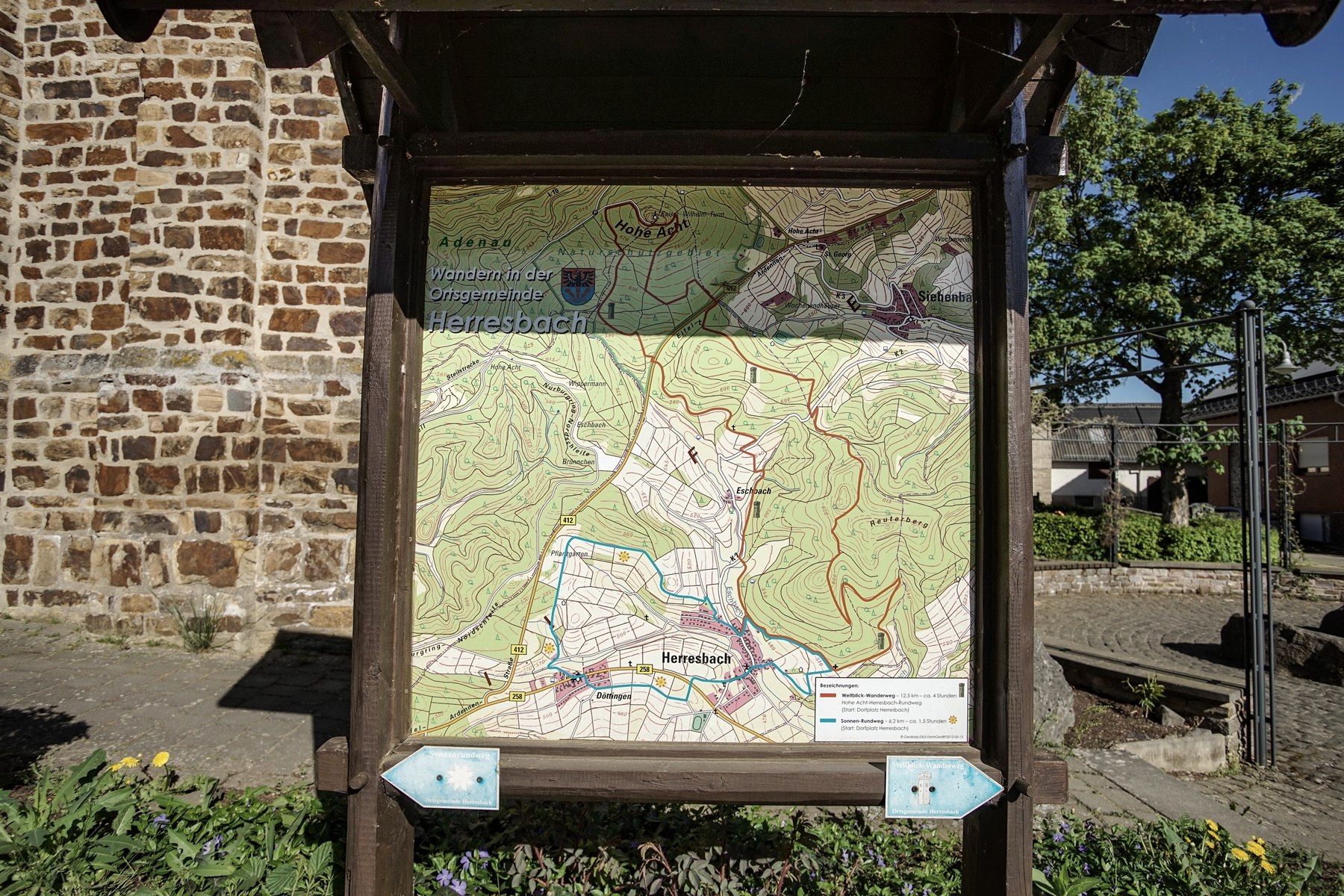 Gestartet wird am Dorfplatz in der Dorfmitte von Herresbach. Hier folgt man der Hauptstraße in Richtung Siebenbach und biegt kurz vor Ortsende rechts in die Waldstraße ab. Dort hält man sich links und geht am Eschbach entlang zur Kreisstraße (K2). Diese wird nach ca. 150 m wieder verlassen.